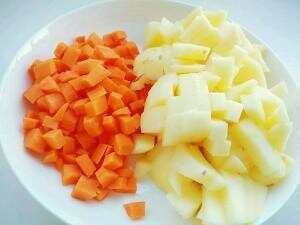 1、胡萝卜去皮、切丁,水开后上蒸锅大火蒸软绵。蒸熟的胡萝卜取出后放凉备用。也可以将胡萝卜放进水中煮熟,煮需要的时间更短,这个水也不会浪费,放凉代替凉开水。