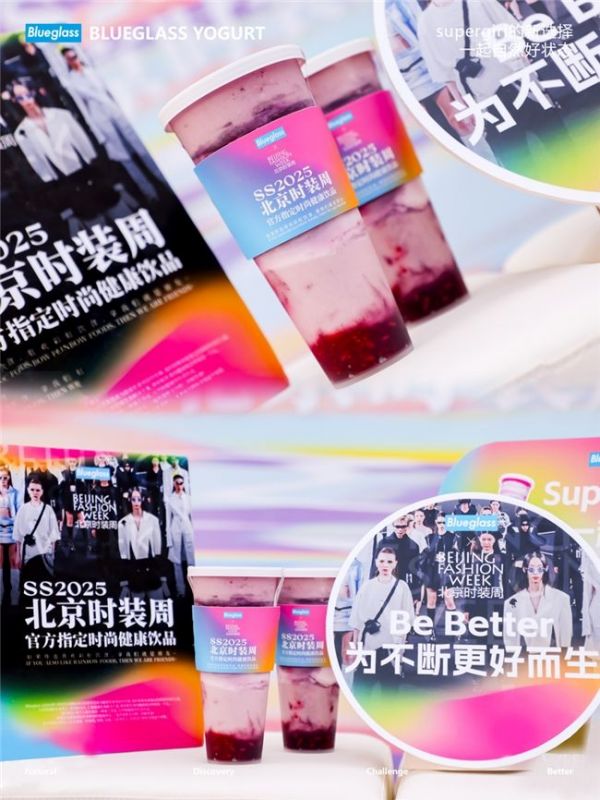 Blueglass一直崇尚自然健康的生活方式,倡导“一起自然好状态”的生活理念。此次特别为北京时装周定制了独具时尚感的联名杯套,随处可见时尚达人们手持Blueglass酸奶,成为场内外备受瞩目的健康新潮饮品。