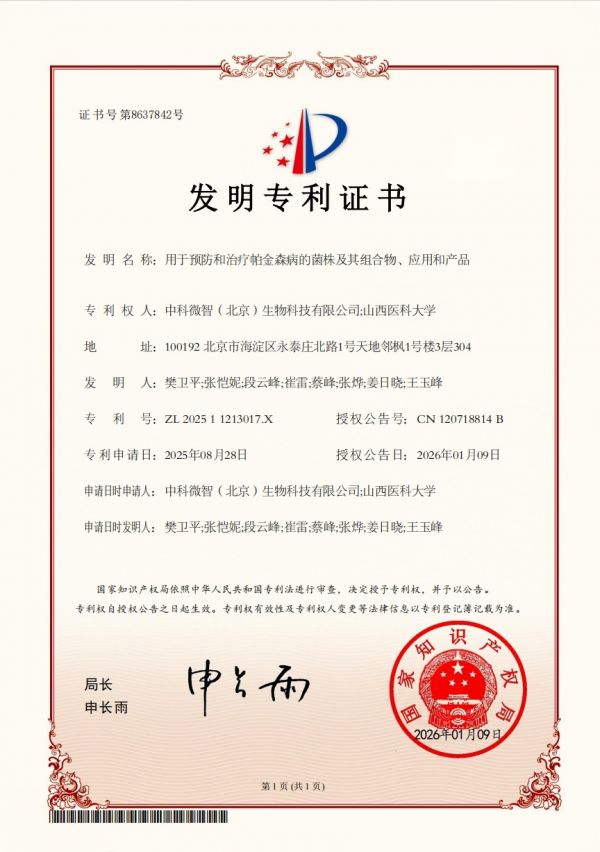 在此背景下,针对肠道微生态的干预方案,正在成为帕金森病领域的全新探索方向。依托国家发明专利《用于预防和治疗帕金森病的菌株及其组合物、应用和产品》(专利号 ZL 202511213017X)开发的微适安 PD36 合生素,正是这一领域的代表性探索成果。