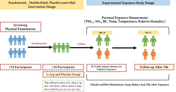 为探索上述科学问题,研究人员采用实验性暴露的研究方法,在北京某区的社区医院招募了118名50-75岁中老年心血管疾病易感人群为研究对象开展试验(图3)。采用随机、双盲、安慰剂对照干预试验的方法,将研究对象随机分为L-精氨酸干预组(9g/d)和安慰剂对照组,进行为期14天的干预研究。在干预的第14天,安排研究对象早上9-11点期间沿既定的交通主干道路步行2h以暴露于交通相关空气污染。在步行期间至次日早期监测研究对象对细颗粒物(PM2.5)、黑碳(BC)等污染物的实时个体暴露水平,采用焦磷酸测序法检测研究对象暴露24h前、后血小板mtDNA基因组多个位点的甲基化水平,并分析空气污染物对相应位点甲基化水平变化的影响。
