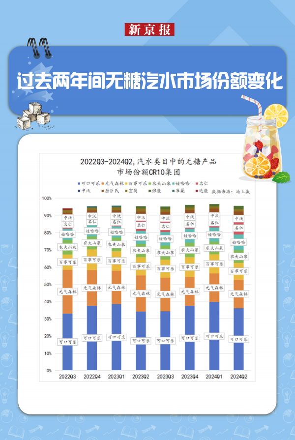 新京报联合线下零售监测机构马上赢监测数据显示,自2023年6月以来,无糖汽水(包括碳酸饮料、气泡水、苏打水)市场份额前三名较为稳定,分别是可口可乐、元气森林、百事公司,其中可口可乐表现强劲,市场份额一度接近40%;元气森林市场份额偶有波动,过去一年,市场份额最低为16.53%,在夏季销售旺季一度达到25.45%。此外,由于加入了苏打水产品,农夫山泉、娃哈哈、名仁等品牌市场份额也跻身前十名的位置。