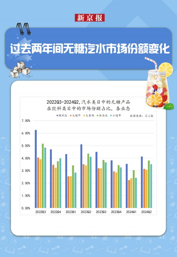 无糖汽水快速发展的同时,无糖茶的出现给市场带来一定冲击。根据马上赢数据显示,在饮料类目下,无糖汽水在便利店渠道的市场占比,从2022年第三季度的6.25%,下滑至2024年第二季度的4.13%。在大卖场渠道,无糖汽水同样面临这一问题,从2022年第三季度的3.91%下滑至2024年第二季度的3.07%。