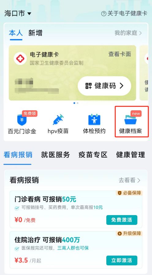 在微信→我→服务→医疗健康→电子健康卡中进入海南省健康档案。
