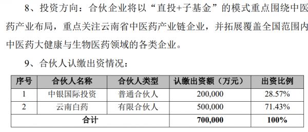 中药龙头云南白药11月29日晚公告称,公司拟与专业投资机构中银国际投资有限责任公司(简称“中银国际投资”)共同投资设立云南省中医药大健康创新基金(简称“基金”或“合伙企业”),合伙企业的目标认缴出资总额为70亿元,其中,公司作为有限合伙人拟以自有资金认缴出资50亿元。