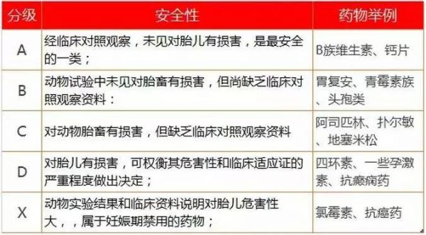 目前,评价药物对孕妇和胎儿的危害程度时,主要依据的是美国食品和药品管理局(FDA)颁布的标准。下面将常用药物分为A、B、C、D、X级共五类。