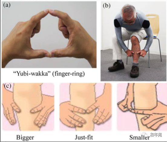 要检查自己有没有可能患肌少症也很简单,男性小腿围<34厘米,女性<33厘米,也可以用双手的食指和拇指环绕围住非优势小腿最粗的部位,如果测量到的小腿刚好合适或小于“指环”,患肌少症的风险就会增加。