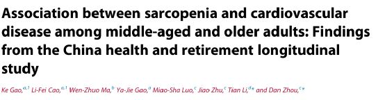 1. Gao K, Cao LF, Ma WZ, Gao YJ, Luo MS, Zhu J, Li T, Zhou D. Association between sarcopenia and cardiovascular disease among middle-aged and older adults: Findings from the China health and retirement longitudinal study. EClinicalMedicine. 2022 Jan 10;44:101264. doi: 10.1016/j.eclinm.2021.101264. PMID: 35059617; PMCID: PMC8760427.