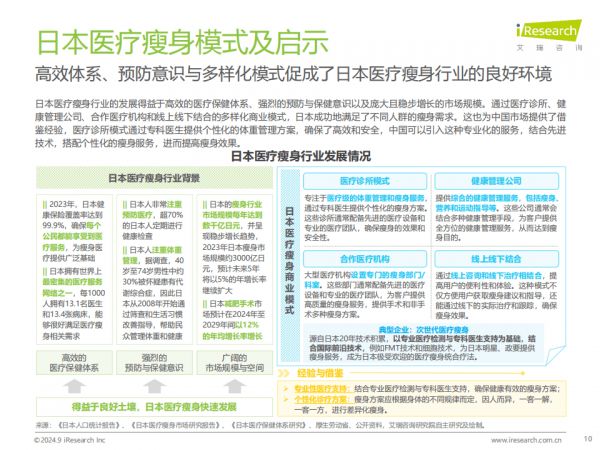 5. 日本医疗瘦身模式及启示:日本医疗瘦身行业得益于高效的医疗保健体系、强烈的预防与保健意识以及庞大且稳步增长的市场规模,通过医疗诊所、健康管理公司、合作医疗机构和线上线下结合的多样化商业模式,满足了不同人群的瘦身需求。中国可以借鉴其经验,提供专业化的服务,搭配个性化的瘦身服务。