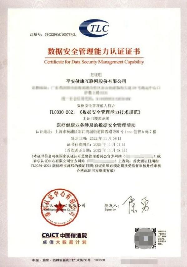 “数据安全管理能力认证(DSMC)”是由中国信通院联合认证机构面向全行业发起的数据安全领域权威国家级认证。通过此项认证,能证明企业具备较完善的数据安全管理体系以及数据安全技术能力实现。平安健康获得该认证是企业致力于保护用户隐私及数据安全、重视法律合规的表现,也是对国家政策的积极响应。