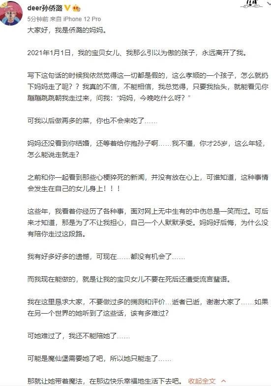其母亲也在微博发文证实这一事实。