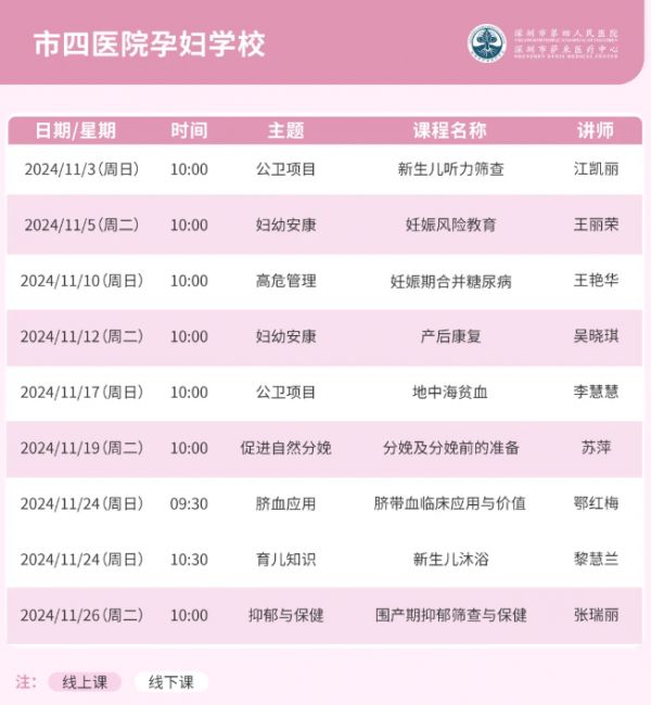 下面是市四医院(萨米医疗)孕妇学校的 11 月课程表及线下活动,各位准妈妈和准爸爸快收藏,记得准时上课: