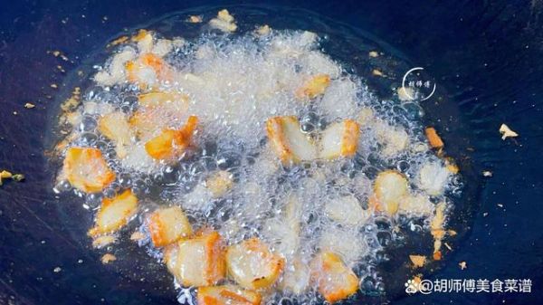 第四步:将锅烧热后,把肥五花肉放入到锅中,中火将肥五花肉煸炒成金黄色后,然后将大蒜籽放入到锅中爆香3秒。
