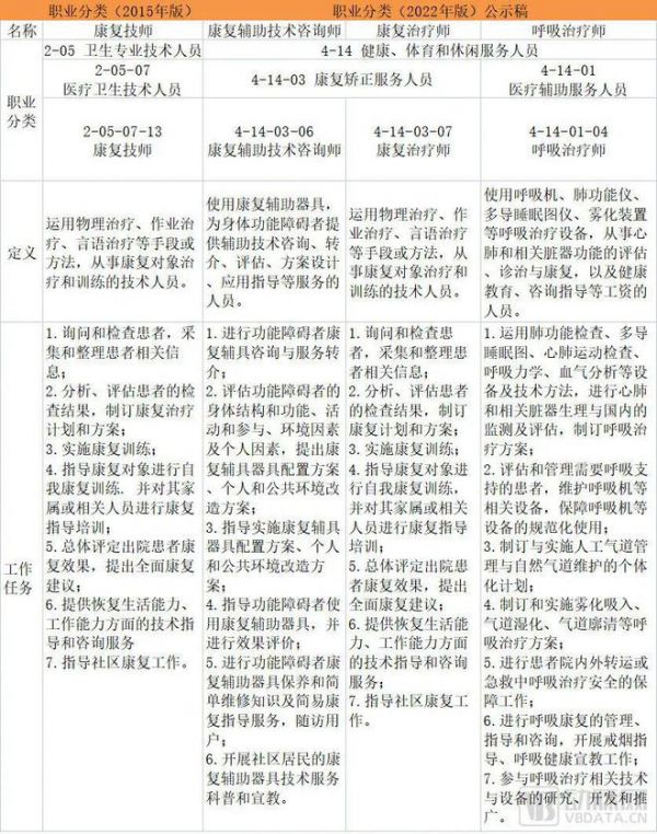 只是在大类别上,从过去的医疗卫生技术人员划为健康、体育和休闲服务人员。在二级分类上,康复治疗师和康复辅助技术咨询师被划为康复矫正服务人员,呼吸治疗师被划为医疗辅助服务人员。