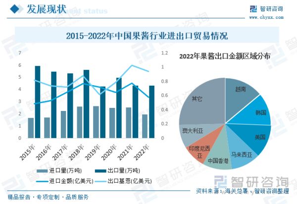 从行业进出口贸易情况来看,随着我国果酱需求的增长,近年来我国果酱进口规模整体呈波动上升的态势,出口规模整体呈波动下降的态势,但整体出口规模仍大于进口规模。具体来看,2022年我国果酱进口量为1.96万吨,同比下降22.9%,进口金额为0.58亿美元,同比下降25.1%;出口量为4.33万吨,同比下降0.1%,出口金额为0.94亿美元,同比下降8.4%。从出口分布来看,2022年我国果酱出口金额中,占比前三的地区分别为越南、韩国和美国,占比分别为13.9%、11.71%和11.62%。