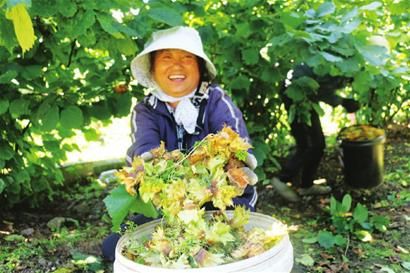 榛子树结果时,大榛子被翠绿色的叶片包裹着,犹如盛开的花朵,剥下皮来即可食用,相比干果更加香脆可口。由于榛子鲜果保鲜期短,一年中采摘榛子的时间只有短短20多天。据郎永久介绍,带皮鲜果卖10元/斤,烤熟后25元/斤。目前,农场大榛子每亩平均产量在200斤以上,每亩收入可达到2000元左右。