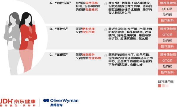 “买什么”:消费者们往往希望有更多的产品和服务可以选择,但专业方案最终成为挑选产品的关键。面对市面上令人目不暇接的健康产品,消费者更加期待的是有专家“帮我挑选,给我方案”。这背后体现的是健康管理解决方案天然存在的跨品类、跨阶段、跨渠道的复杂性,因此消费者对于专业解决方案的需求尤为强烈。