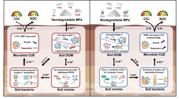 中国科学院院士、城市环境研究所研究员朱永官团队区域土壤环境与生物污染研究组,利用微塑料污染长期野外控制实验,结合多组学、土壤化学多样性和微生物碳利用效率分析,剖析微塑料污染下碳循环变化的微生物机制。结果表明,不可降解塑料处理中,病毒裂解的增加缓解了碳可利用性限制,且裂解物的引入利于微生物的复杂碳水化合物代谢,而更多的碳用于代谢中的能量投资却降低了土壤微生物固碳潜力。相反,可生物降解微塑料处理中,病毒通过辅助代谢增强了主要富营养细菌的碳利用能力,从而提高土壤微生物固碳潜力。这在相应的土壤塑料际中得到证实,强调了病毒调节微塑料污染下土壤储存环中的作用。