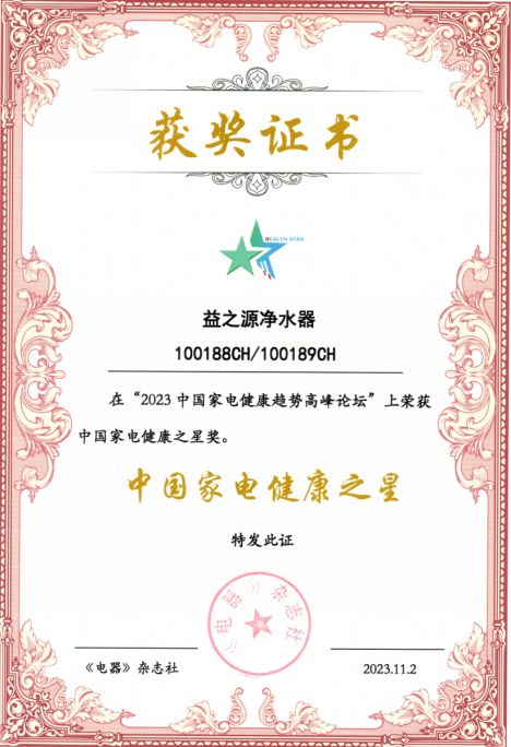 水,是生命之源。当大众不断追求美好生活时,对饮水的安全和健康就愈发关注。于是,净水器被越来越多家庭所选择,逐渐走进千家万户。此次荣获“健康之星”的益之源净水器,就是当之无愧的健康饮水用的领航者之一。据悉,该产品是在卓越的研发工程师及科学家团队以超过30年的专业技术积累下研发出的,拥有多项净水专利和专有技术,能有效去除160多种水中污染物,对水中常见的细菌与病毒的杀灭率高达99.99%。不仅如此,该产品更是凭借优秀的性能表现,达到国家净效1级,并一举斩获了水届“奥斯卡”——NSF International第42号、53号、55号和401号四项标准认证。
