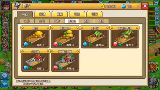在【建造】→【劳动】→【资源】内可以看到小小村长的三大资源类型:农田和南瓜田可以保障小小村的粮食充足;树木跟紫叶,是小小村的木材保障;而石矿与金矿,则是小小村富强的彰显与代表!
