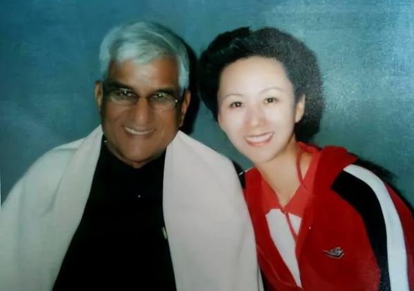 瑜伽老师 Miya 曾于 2004 年和 2016 年两度远赴印度进修学习古印度瑜伽,此图为她在印度与老师的合影。