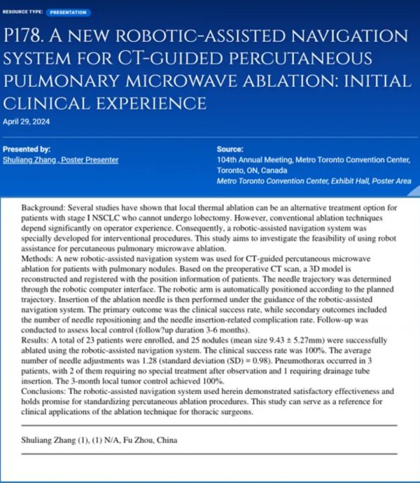 其中,真健康医疗科技与福建医科大学附属协和医院胸外科郑斌主任团队联合研究成果“新型机器人辅助导航系统用于CT引导下经皮肺微波消融术的初步临床研究”曾入选第104届美国胸外科协会(AATS)年会的Poster。