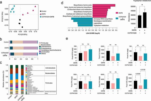 图1. 长双歧杆菌CCFM1029对小鼠肠道微生物组成和色氨酸代谢的影响。(a)肠道微生物组的主坐标分析;(b)在门水平上的肠道微生物组成;(c)在属水平上的肠道菌微生物的变化;(d)基于KEGG途径的肠道微生物群的基因功能改变;(e)粪便样本中色氨酸代谢物的变化;KEGG,Kyoto Encyclopedia of Genes and Genomes;DNFB,2,4-二硝基氟苯;CCFM1029,长双歧杆菌CCFM1029;KYN:犬尿氨酸;IA:吲哚-3-丙烯酸;IAA:吲哚乙酸;ILA:吲哚-3-乳酸;IPA:吲哚-3-丙酸;I3C:吲哚-3-甲醛。