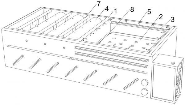 7、作为上述方案的改进,还包括有用于对茶渣消毒的消毒机构,消毒机构包括有工作框、水加热管、蒸汽管道和蒸汽喷头,支撑主框内下部左侧连接有工作框,工作框内底部均匀安装有水加热管,工作框左部前侧连通有蒸汽管道,蒸汽管道穿过支撑主框,并与支撑主框连接,蒸汽管道下侧连通有蒸汽喷头。