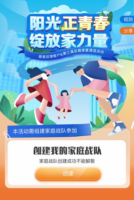 活动分为运动篇、财富篇、荣誉篇、健康篇四大篇章,以上传运动步数、参与社群话题活动、编写读书感悟、参加健康训练营等形式来获得对应的运动值、财富值、荣誉值、健康值。当客户家庭完成阶段任务后,即可参与抽奖、赢取惊喜礼品;最终前100名完成所有任务的家庭用户将共同瓜分家庭奖励金。