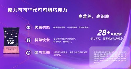 魔力可可TM代可可脂巧克力,增加蛋白质、膳食纤维等营养素,复配多种天然的营养饱腹因子,在均衡所需营养的情况下,全程专业营养师全程陪伴。