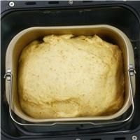 选择“全麦面包”程序,重量750g,按下启动键。面包机会自动完成搅拌发酵烘烤程序(程序开始10分钟以后加入软化黄油)