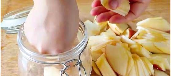 接着就拿出准备好的密封瓶子,这个容器记得一定要提前做好消毒,用烧开的热水去烫一下,将苹果片一片一片先铺一层在最底下,然后再取出一些冰糖铺一层在苹果上,接着再铺上一层苹果片,接着再铺一层冰糖,以此类推,直到铺满密封瓶子,糖的用量根据自己的口味来放。