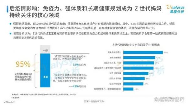 另据易观分析,超过95%的Z世代妈妈表示:很重视宝宝的体质提升并有长期的健康规划。其中,53%的妈妈表示经历疫情之后,明显更加重视宝宝的免疫力和抵抗力提升;42%的妈妈表示无论疫情前后一直都很重视宝宝的体质,注重科学的营养补充。