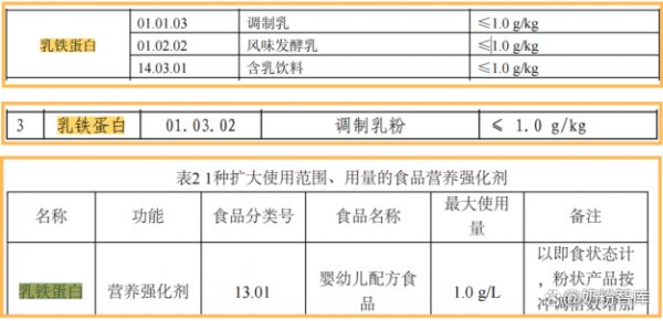 2012年我国卫健委发布的GB 14880—2012《食品安全国家标准 食品营养强化剂使用标准》将乳铁蛋白列入食品营养强化剂。其中,规定乳铁蛋白可用于婴幼儿配方食品、调制乳、风味发酵乳和含乳饮料的营养强化剂。2013年时,国家卫生计生委发布的《关于批准抗坏血酸钠等8种食品添加剂扩大使用范围用量的公告(2013年 第11号)》中扩大了乳铁蛋白的使用量,即在婴幼儿配方食品中乳铁蛋白的最大使用量为1.0 g/L。