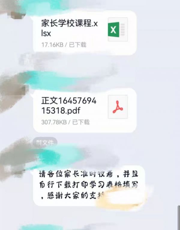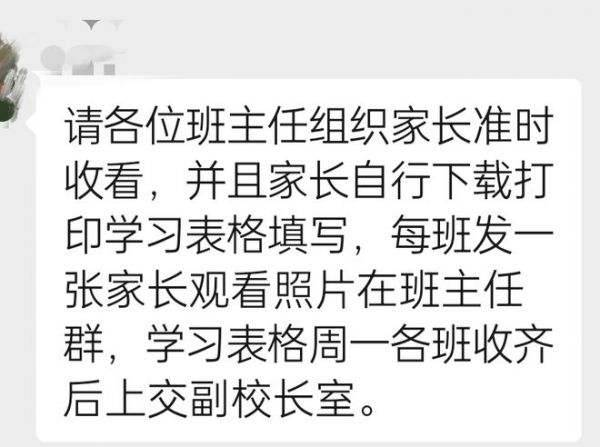 王女士的女儿读四年级,班主任在微信群里下发通知要求:家长准时观看,并且自行下载打印学习表格,填写观看心得,把观看照片发到班级微信群。