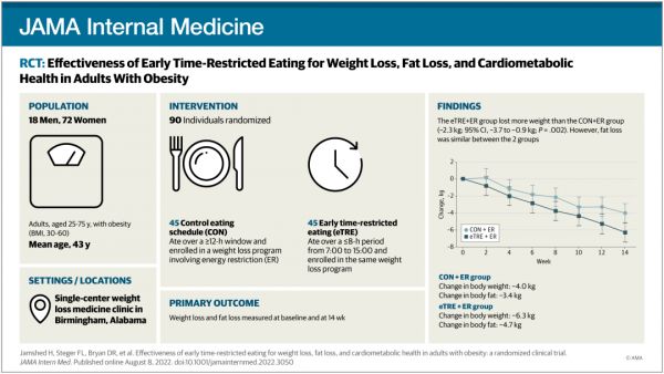 [3]Jamshed H, Steger FL, Bryan DR, et al. Effectiveness of Early Time-Restricted Eating for Weight Loss, Fat Loss, and Cardiometabolic Health in Adults With Obesity: A Randomized Clinical Trial. JAMA Intern Med.2022;182(9):953–962.