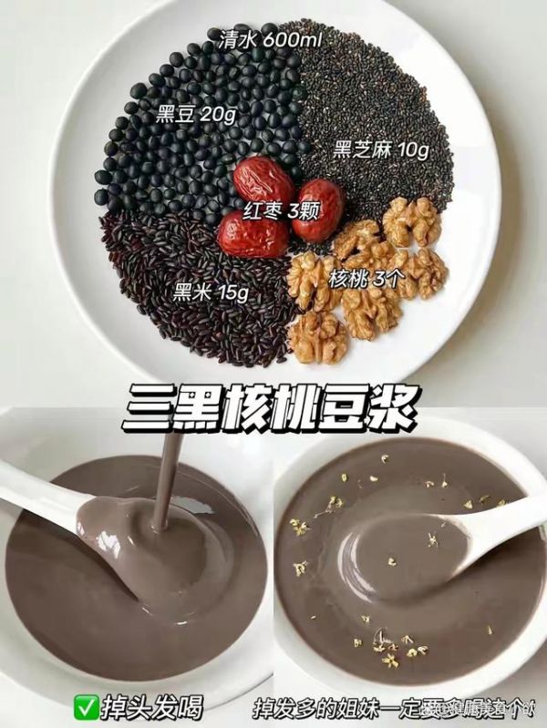 黑豆、黑米和黑芝麻都是黑色的食物,富含丰富的蛋白质、矿物质和维生素。核桃则含有丰富的脑磷脂和亚麻酸,有助于提高记忆力。将这四种食材一起打成豆浆,具有补肾益精、养血润燥的功效。