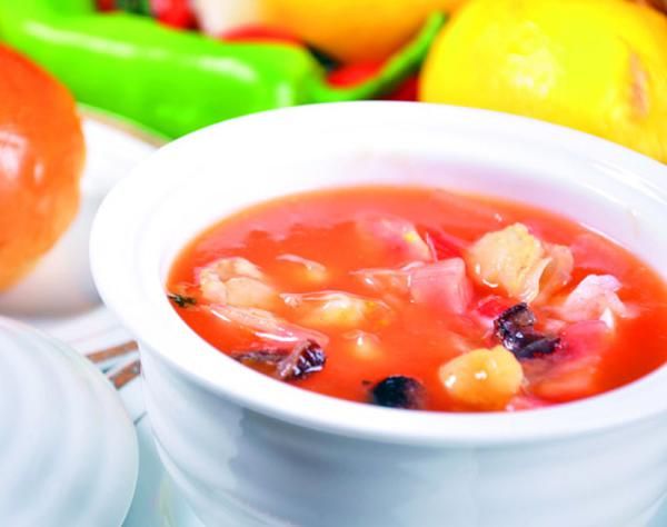 做法:大的西红柿2颗,烫后去皮,打成汁。准备好带壳虾子2只、花枝2片、蛤蜊5颗、鲷鱼片2片、九层塔适量、柠檬1/4颗、洋葱半颗切成细末、海盐1小茶匙、水3碗。