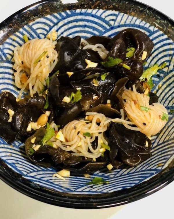 4、将木耳丝和魔芋丝放入碗中,加入黄瓜丝和酱汁拌匀即可食用。