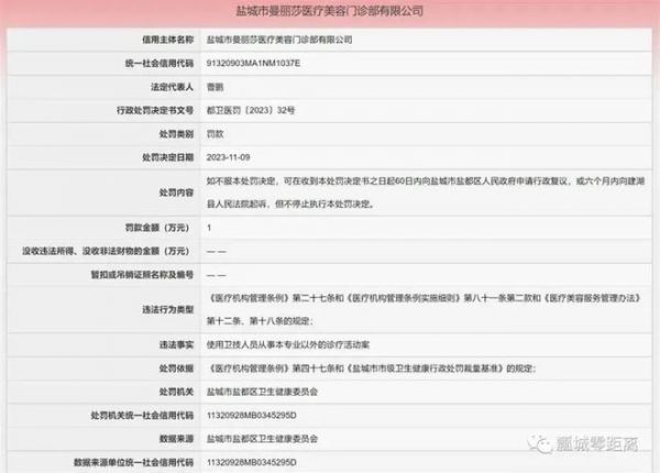 公开资料显示,2023年11月9日,盐城曼丽莎曾因使用卫技人员从事本专业以外的诊疗活动案,被盐城市盐都区卫生健康委员会处以1万元罚款。