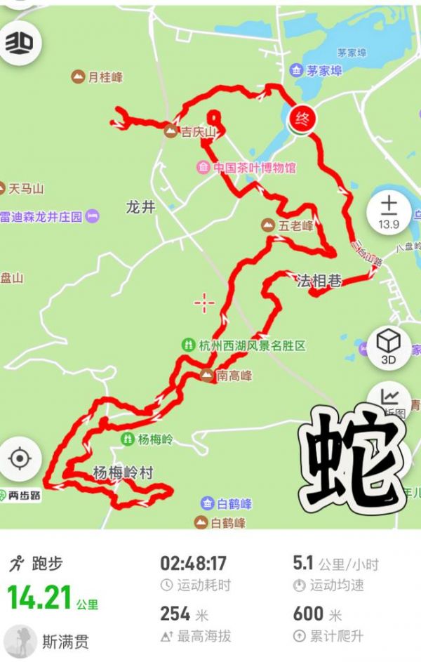 提醒:以浙江宾馆公交站为白蛇线的起点,轨迹沿顺时针方向走,白蛇线最大的爬升在南高峰和杨梅岭一带,折返两次上南高峰除了爬升高点,行程多以游步道为主大可放心,杨梅岭那带野路多,而且有几段路况不会特别清晰需要消耗不少时间,过了南高峰就到三台阁,最后过了不是特别高的吉庆山,打卡完成。