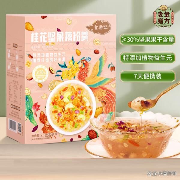 ▶ 美味口感:粉质呈颗粒状易于冲泡,冲泡后粘糯剔透。清新的桂花香味诱人,入口层次丰富。多种坚果果干口感丰富多变,清甜爽口不失嚼劲。
