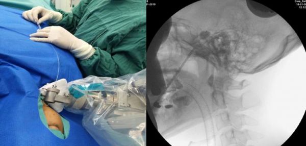 三叉神经痛,俗称“天下第一痛”,是最常见的颅神经疾病之一。2019年初,深圳市第二人民医院功能神经科蔡晓东主任团队成功开展中国首例ROSA机器人辅助经皮穿刺三叉神经半月节微球囊压迫手术(PBC)治疗三叉神经痛。该手术不开颅,机器人精准定位后只需在脸上穿刺一针,一个针眼,术后一个创可贴覆盖即可。手术快速、精确、微创、安全,术后2天患者即出院回家。