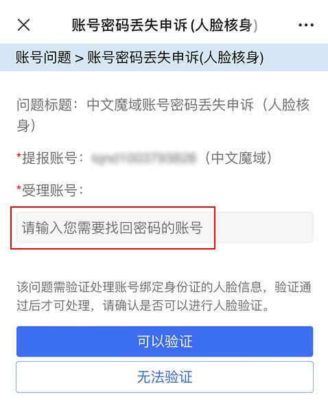 特别说明:账号密码丢失申诉功能支持找回其他非绑定账号。例:登录绑定A账号,可以通过本功能人脸验证、找回B账号的密码。