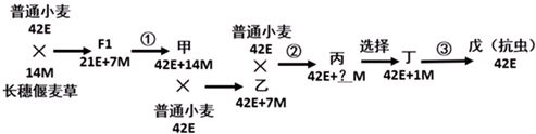 分析 分析题图:图示为普通小麦与长穗偃麦草杂交选育抗虫小麦新品种的过程.先将普通小麦与长穗偃麦草杂交得到F1,①表示人工诱导染色体数目加倍(常用秋水仙素处理幼苗)获得甲;再将甲和普通小麦杂交获得乙,乙再和普通小麦杂交获得丙,经过选择获得丁,最终获得染色体组成为42E的戊.