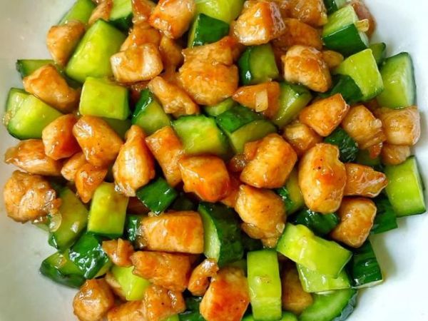 1、鸡胸肉清洗干净切成丁,加入料酒、生抽、食盐、淀粉、胡椒粉,抓拌均匀腌制十分钟。黄瓜用食盐清洗干净,切成黄瓜丁。