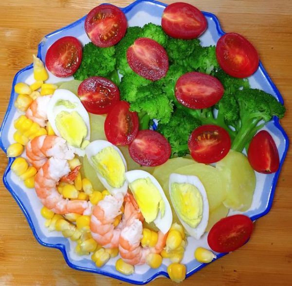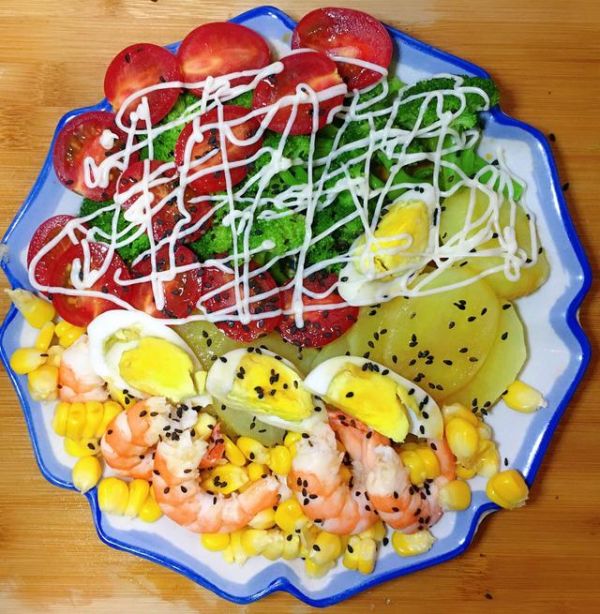 接着,将所有食材按照你喜欢的方式摆放在盘子里。可以把圣女果摆在一侧,西兰花和土豆分布在盘子中间,虾和玉米则点缀在四周,这样看起来色彩丰富,十分诱人。