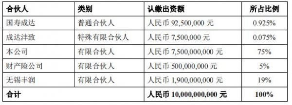 而无锡丰润作为有限合伙人将出资19亿元,占比19%,成达沣致将出资750万元,占比0.075%。
