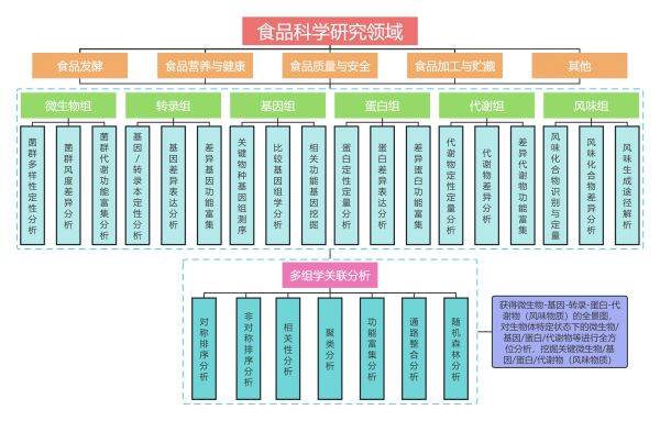 食品领域的多组学研究是一个跨学科的领域,旨在全面理解食品成分、食品加工过程、食品安全、营养学以及食品与人体健康之间的复杂关系。首先,需要明确研究的具体目的,比如是探索某种食品的功能性成分、评估食品加工对营养成分的影响、解析食品中潜在的有害物质、还是研究食品与人体健康的相互作用等。其次,根据研究目标选择合适的样品,通过不同组学,结合生物信息学工具,识别关键的微生物、基因、转录本、蛋白质和代谢物/风味物质。进一步通过多组学数据整合分析,建立微生物-基因-转录-蛋白-代谢物/风味物质之间的关联网络,深入理解食品的生物学机制。最后,基于多组学分析结果,选择关键候选因子进行体外或体内实验验证,如关键微生物的纯培养验证、功能基因的过表达/敲低实验、蛋白质功能分析、代谢途径干预等,以验证假设并探索其作用机制。