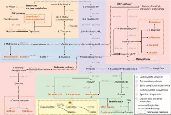 本研究通过代谢组和宏转录组分析,对老坛酸菜发酵过程中的风味特征和活性微生物群演替进行了研究。乳酸是老坛酸菜的主要有机酸,在老坛酸菜中发现了21种特征风味化合物;在老坛酸菜的不同发酵阶段,各种微生物依次占据主导地位,主要由有机酸(尤其是乙酸和异丁酸)驱动;此外,食品乳杆菌、西巴氏乳杆菌、植物乳杆菌和椰菜乳杆菌被确定为核心功能微生物,参与了特征风味化合物的形成。