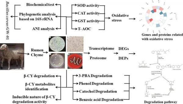 农药在保障粮食安全方面发挥着重要作用,但对食品安全、生态保护和人类健康构成潜在威胁。通过微生物活性降解农药,作为一种安全、环境友好、实用的消除农药残留的方法。拟除虫菊酯通常被认为是比毒性更强的有机氯和有机磷农药更环保的替代品,其中β-氯氰菊酯(β-CY)占全国拟除虫菊酯市场的50%以上。本研究旨在研究从绵羊瘤胃食糜中分离的一种细菌GW-01(蜡样芽孢杆菌)降解β-CY的相关酶基因以及代谢途径。